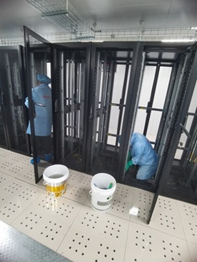 760平方通信公司數(shù)據(jù)機房深度清潔,清潔范圍:頂面,墻壁,地面,高架地板架空層,回風(fēng)通道,附屬設(shè)施,機柜表面。