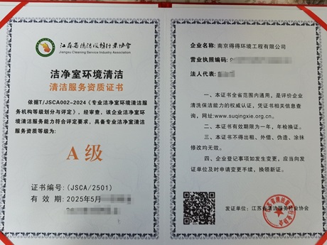 祝賀南京得得環(huán)境工程有限公司有限公司榮獲全國首批JSCA潔凈室環(huán)境清潔服務A級資質(zhì)